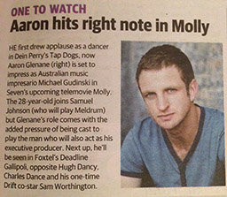 Aaron has been named as one to watch in The Sunday Telegraph. Having recently been announced to play Mushroom Records founder Michael Gudinski in Channel 7's mini series "MOLLY" and with "DEADLINE GALLIPOLI" set for release in April alongside Sam Worthington, Hugh Dancy and Charles Dance it seems Aaron's profile is on the rise.