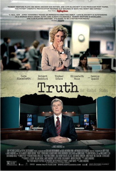 The movie is based on Mary Mapes' book, Truth and Duty. Redford plays Dan Rather, Blanchett plays Mapes, his producer, and the film covers when they discovered that George W. Bush may have been AWOL from the United States National Guard during the Vietnam War and what happened to them when they ran the story on 60 Minutes.